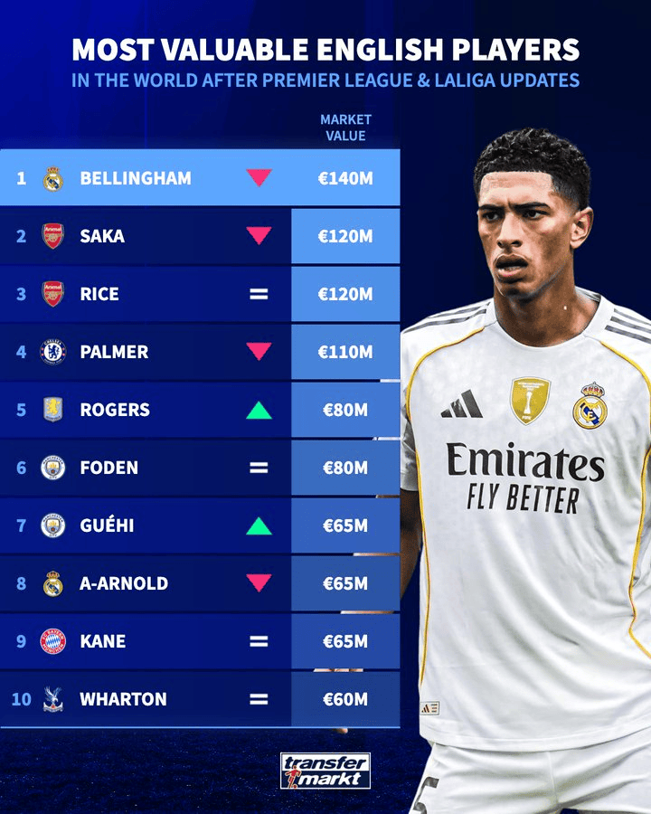 虎扑03月16日讯 德国转会市场在本周内更新了英超、西甲球员的身价,并列出英格兰球员身价排名。