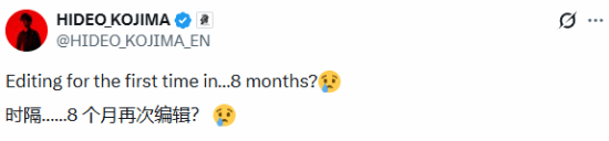 据外媒videogamer报道,在2月5日小岛秀夫在X平台发布剪辑视频的图片,配文“时隔8个月再次剪辑?”,预览黑屏幕疑似显示“小岛秀夫游戏”。