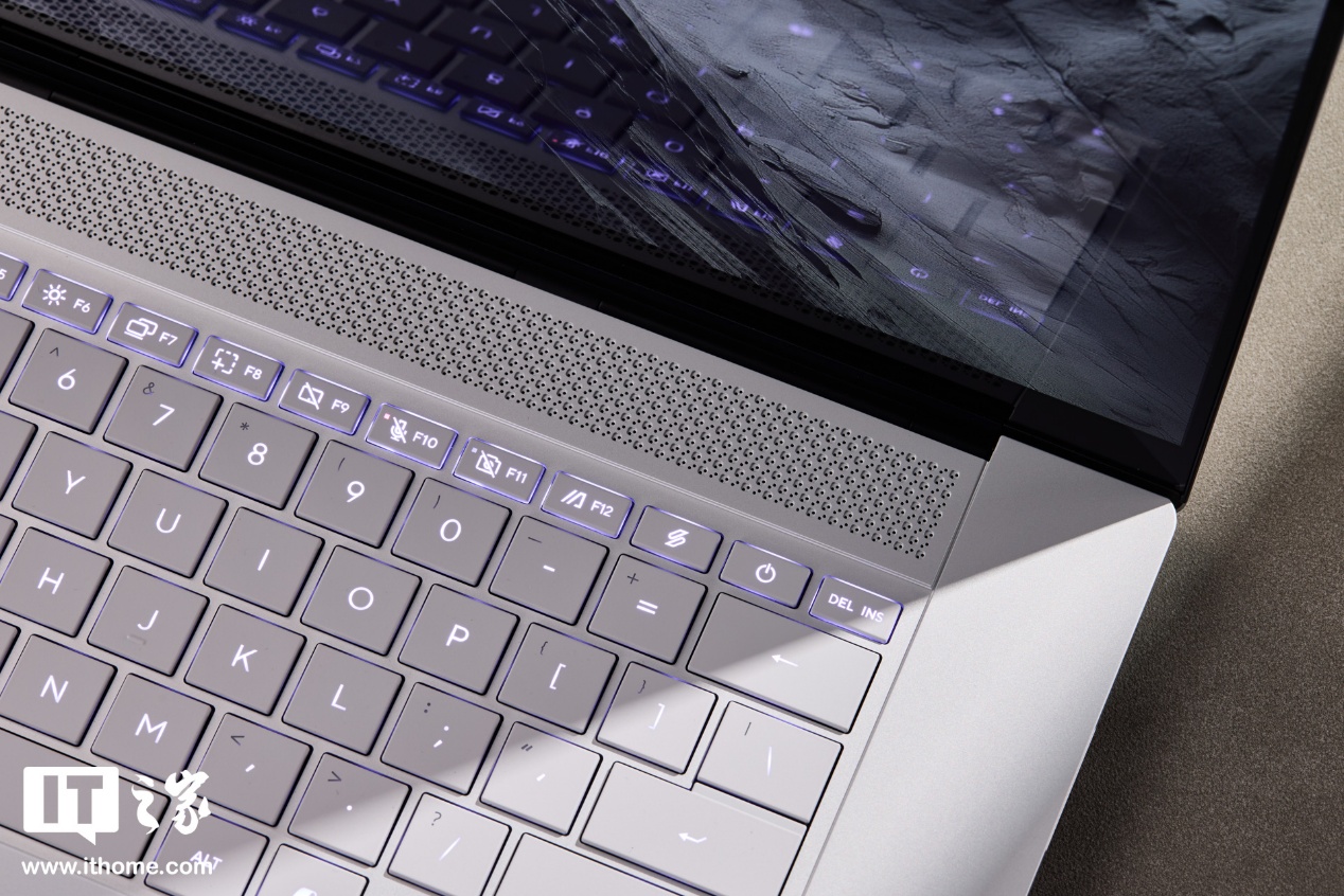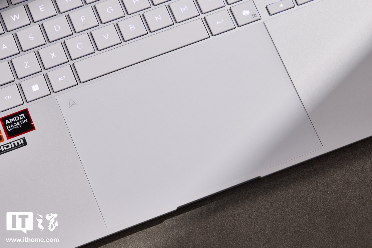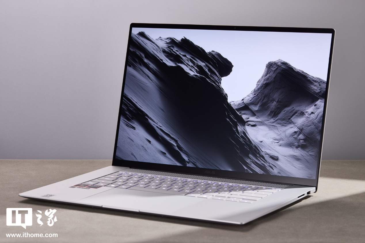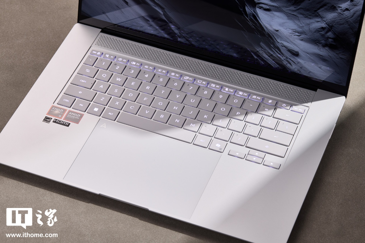 华硕灵耀16 Air 2026 锐龙版的 C 面采用全尺寸大间距方形键盘,支持长键程、居中透光字符和白色背光。